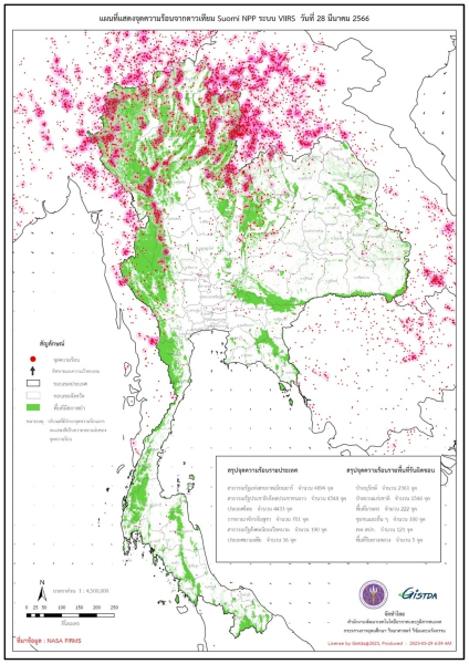 GISTDA เผยข้อมูลจากดาวเทียมซูโอมิ เอ็นพีพี (Suomi NPP) ของวันที่ 28 มีนาคม 2566 ไทยพบจุดความร้อน 4,433 จุด โดยมีเพื่อนบ้านอย่างพม่าขึ้นนำอยู่ที่ 4,894 จุด, สปป.ลาว 4,548 บาท, กัมพูชา 701 จุด, เวียดนาม 190 จุด และ มาเลเซีย 36 จุด