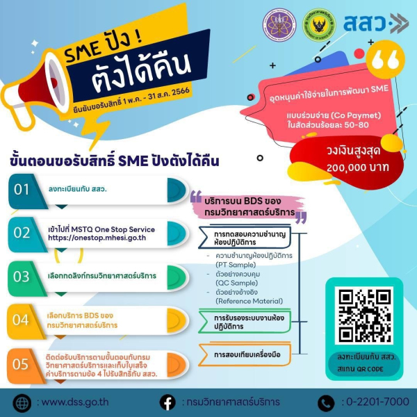 ภายในงานดังกล่าว ดร.จริยาวดี ศิริจันทรา ผู้แทน วศ.อว. ได้ร่วมแลกเปลี่ยนในเวทีเสวนาพร้อมกับ  46 พันธมิตร ทั้งนี้ วศ.อว.ได้ร่วมมือกับ สสว. ในการช่วยเหลือผู้ประกอบการ SME ผ่านช่องทาง BDS ภายใต้โครงการ “SME ปัง!! ตังได้คืน” เป็นการอุดหนุนค่าใช้จ่ายในการพัฒนา SME แบบร่วมจ่าย (Co Payment) ในสัดส่วนร้อยละ 50-80 วงเงินสูงสุด 200,000 บาท สำหรับบริการของ วศ.บนช่องทาง BDS ประกอบด้วย การทดสอบความชำนาญห้องปฏิบัติการ การรับรองระบบงานห้องปฏิบัติการ และการสอบเทียบเครื่องมือ โดยมีขั้นตอนการรับสิทธิ์ “SME ปัง!! ตังได้คืน” 5 ขั้นตอน ได้แก่ (1) ลงทะเบียนกับ สสว. (2) เข้าไปที่ MSTQ One Stop Service http://onestop.mhesi.go.th (3) เลือกกดลิ้งค์กรมวิทยาศาสตร์บริการ (4) เลือกบริการ BDS ของกรมวิทยาศาสตร์บริการ (5) ติดต่อรับบริการตามขั้นตอนของ วศ. และเก็บใบเสร็จค่าบริการไปรับสิทธิ์กับ สสว. ต่อไป ซึ่งจะหมดเขตการรับสิทธิ์ฯ ภายในวันที่ 31 สิงหารม 2566 ผู้สนใจสามารถเข้าไปดูรายละเอียดได้ที่เว็บไซต์กรมวิทยาศาสตร์บริการ