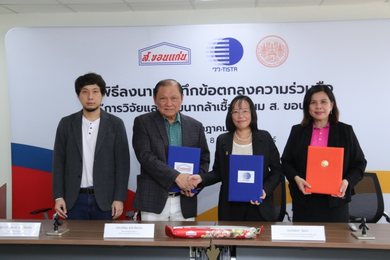 ดร.โศรดา วัลภา รองผู้ว่าการวิจัยและพัฒนาด้านอุตสาหกรรมชีวภาพ สถาบันวิจัยวิทยาศาสตร์และเทคโนโลยีแห่งประเทศไทย (วว.) กระทรวงการอุดมศึกษา วิทยาศาสตร์ วิจัยและนวัตกรรม (อว.) ลงนามบันทึกข้อตกลงความร่วมมือการวิจัยและพัฒนากล้าเชื้อแหนม ส.ขอนแก่น กับ ดร.เจริญ รุจิราโสภณ ประธานกรรมการบริหาร บริษัท ส.ขอนแก่นฟู้ดส์ จำกัด (มหาชน) และ รศ.ดร.นภัสรพี เหลืองสกุล คณบดี คณะอุตสาหกรรมอาหาร สถาบันเทคโนโลยีพระจอมเกล้าเจ้าคุณทหารลาดกระบัง (สจล.) โดยมีวัตถุประสงค์เพื่อแลกเปลี่ยนความรู้ในด้านเทคโนโลยีชีวภาพและเทคโนโลยีการอาหาร การพัฒนาศักยภาพบุคลากร เทคโนโลยีและนวัตกรรม การพัฒนาผลิตภัณฑ์เชื้อจุลินทรีย์สำหรับอาหารและศึกษาคุณสมบัติในการเป็นโพรไบโอติกส์ของกล้าเชื้อ ส.ขอนแก่น และ วว. พร้อมผลักดันให้งานวิจัยสามารถนำไปใช้ในเชิงพาณิชย์ โอกาสนี้ผู้บริหารและบุคลากรทั้งสามหน่วยงานร่วมเป็นเกียรติและแสดงความยินดีด้วย ในวันที่ 10 กรกฎาคม 2566 ณ อาคาร ส.ทาวเวอร์ อ.บางพลี จ.สมุทรปราการ