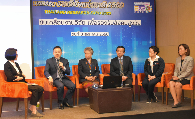 วันที่ 8 สิงหาคม 2566 ที่ห้องประชุมโลตัส 3-4 ชั้น 22 โรงแรมเซ็นทาราแกรนด์ และบางกอกคอนเวนชั่นเซ็นเตอร์ เซ็นทรัลเวิลด์ กรุงเทพ ภายในงาน“มหกรรมงานวิจัยแห่งชาติ 2566” หรือ “ Thailand Research Expo 2023” สำนักงานการวิจัยแห่งชาติ (วช.) กระทรวงการอุดมศึกษา วิทยาศาสตร์ วิจัยและนวัตกรรม (อว.) จัดเสวนาวิชาการ เรื่อง “ขับเคลื่อนงานวิจัย เพื่อรองรับสังคมสูงวัย” ขึ้น เพื่อเป็นเวทีในการเผยแพร่ผลงานวิจัยที่มีคุณภาพและมีศักยภาพในการนำไปสู่การใช้ประโยชน์ เกิดการเชื่อมโยงบูรณาการองค์ความรู้ และผลักดันให้เกิดการนำผลงานวิจัยไปใช้ประโยชน์ในมิติต่าง ๆ เพื่อพัฒนาคุณภาพชีวิตของผู้สูงอายุ โดยมีผู้ร่วมเสวนาประกอบด้วย ศาสตราจารย์ พญ.จิรพร เหล่าธรรมทัศน์ ผู้ช่วยเลขาธิการราชวิทยาลัยจุฬาภรณ์ นพ.ภูษิต ประคองสาย เลขาธิการมูลนิธิสถาบันวิจัยและพัฒนาผู้สูงอายุไทย รองศาสตราจารย์ ดร. นัทธี สุรีย์ รองผู้อำนวยการฝ่ายนวัตกรรมการศึกษา วิทยาลัยการศึกษาตลอดชีวิต มหาวิทยาลัยเชียงใหม่ ศาสตราจารย์ ระพีพรรณ คำหอม ประธานหน่วยบูรณาการประเด็นยุทธศาสตร์ด้านสังคมสูงวัยจากสำนักงานคณะกรรมการส่งเสริมวิทยาศาสตร์ วิจัยและนวัตกรรม (สกสว.) และคุณศิรินทร์พร เดียวตระกูล ผู้อำนวยการภารกิจการวิจัยและนวัตกรรมของประเทศด้านการรองรับสังคมสูงวัย จากสำนักงานการวิจัยแห่งชาติ (วช.) โดยมี ผศ.ดร.แพร ศิริศักดิ์ดำเกิง จากมหาวิทยาลัยศิลปากร เป็นผู้ดำเนินรายการ