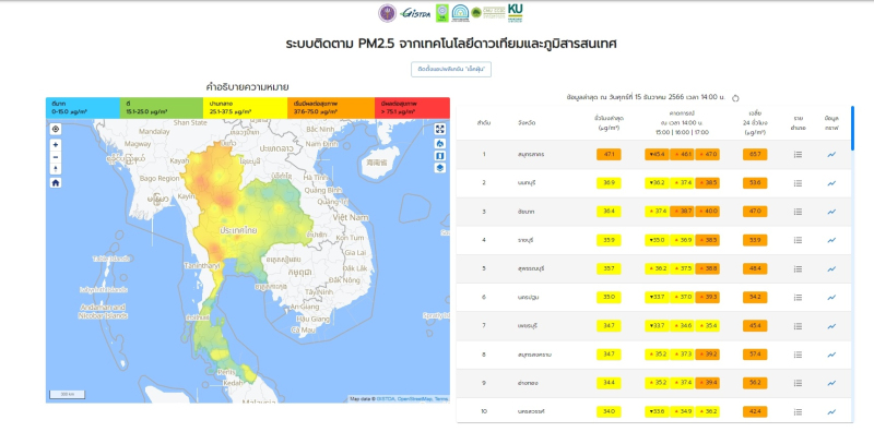 GISTDA เกาะติดสถานการณ์ฝุ่น PM 2.5 แบบรายชั่วโมง ด้วยข้อมูลจากดาวเทียมผ่านแอปพลิเคชั่น “เช็คฝุ่น” เมื่อเวลา 14.00 น. ของวันที่ 15 ธันวาคม 2566 พบว่า จังหวัดสมุทรสาคร มีค่าฝุ่นเกินมาตรฐานและเริ่มส่งผลกระทบต่อสุขภาพระดับสีส้ม อยู่ที่ 47.1 ไมโครกรัม