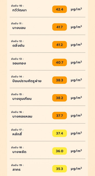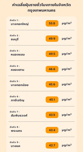 ในขณะที่กรุงเทพมหานคร พบค่าฝุ่น PM2.5 เกินมาตรฐานในระดับสีส้ม 16 เขต สูงสุด 3 ลำดับอยู่ที่ บากกอกใหญ่ 55.8 ไมโครกรัม ตามด้วย ธนบุรี 49.9 ไมโครกรัม และหนองแขม 49.5 ไมโครกรัมตามลำดับ