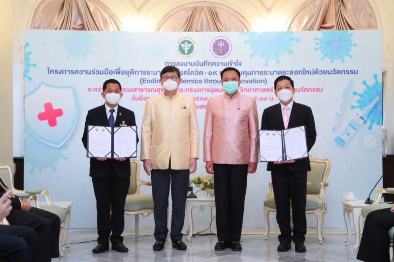 (5 ตุลาคม 2564) หลังการประชุมคณะรัฐมนตรี นายอนุทิน ชาญวีรกูล รองนายกรัฐมนตรี และรัฐมนตรีว่าการกระทรวงสาธารณสุข (สธ.) และ ศ. (พิเศษ) ดร.เอนก เหล่าธรรมทัศน์ รัฐมนตรีว่าการกระทรวงการอุดมศึกษา วิทยาศาสตร์ วิจัยและนวัตกรรม (รมว.อว.) พร้อมด้วย นพ.เกียรติภูมิ วงศ์รจิต ปลัดกระทรวงสาธารณสุข และ ศ.ดร.นพ.สิริฤกษ์ ทรงศิวิไล ปลัดกระทรวงการอุดมศึกษา วิทยาศาสตร์ วิจัยและนวัตกรรม ได้ร่วมหารือและลงนามบันทึกข้อตกลงการผลักดัน โครงการความร่วมมือเพื่อยุติการระบาดของโรคโควิด-19 และควบคุมการระบาดระลอกใหม่ด้วยนวัตกรรม (Ending Pandemics through Innovation) มุ่งเน้นการนำนวัตกรรมทั้งด้านสังคมและด้านวิทยาศาสตร์และเทคโนโลยีมาใช้ขับเคลื่อนการดำเนินงานตามแผนปฏิรูปประเทศด้านสาธารณสุข เพื่อยุติการระบาดของโรคโควิด-19 อย่างรวดเร็วและเบ็ดเสร็จ และลดผลกระทบที่เกิดขึ้นให้ประชาชนสามารถอยู่กับโควิด-19 ได้อย่างปลอดภัย รวมถึงเตรียมการป้องกันการระบาดระลอกใหม่และจากเชื้อโรคใหม่ในอนาคต ตลอดจนการประสานภาคีเครือข่ายของทั้งสองกระทรวงในบทบาทหน้าที่ความรับผิดชอบของทุกภาคส่วนมุ่งสู่เป้าหมายสำคัญให้ประชาชนสามารถใช้ชีวิตตามปกติได้โดยเร็ว