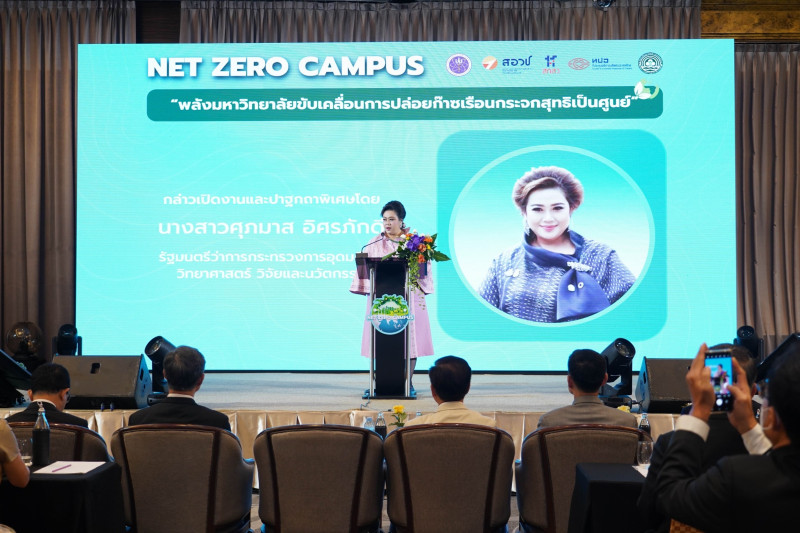 เมื่อวันที่ 28 มี.ค. น.ส.ศุภมาส อิศรภักดี รมว.การอุดมศึกษา วิทยาศาสตร์ วิจัยและนวัตกรรม (อว.) เป็นประธานเปิดงานประชุมสัมมนาพร้อมกล่าวปาฐกถาพิเศษ “พลังมหาวิทยาลัยขับเคลื่อนการปล่อยก๊าซเรือนกระจกเป็นศูนย์ (Net Zero Campus)" จัดโดย กรมการเปลี่ยนแปลงสภาพภูมิอากาศและสิ่งแวดล้อม (สส.) สำนักงานสภานโยบายการอุดมศึกษา วิทยาศาสตร์ วิจัยและนวัตกรรมแห่งชาติ (สอวช.) สำนักงานคณะกรรมการส่งเสริมวิทยาศาสตร์ วิจัยและนวัตกรรม (สกสว.) และที่ประชุมอธิการบดีแห่งประเทศไทย (ทปอ.) โดยมีมหาวิทยาลัยกว่า 170 แห่งเข้าร่วม ณ ห้องประชุมกมลทิพย์ 2-3 โรงแรม เดอะ สุโกศล กรุงเทพฯ