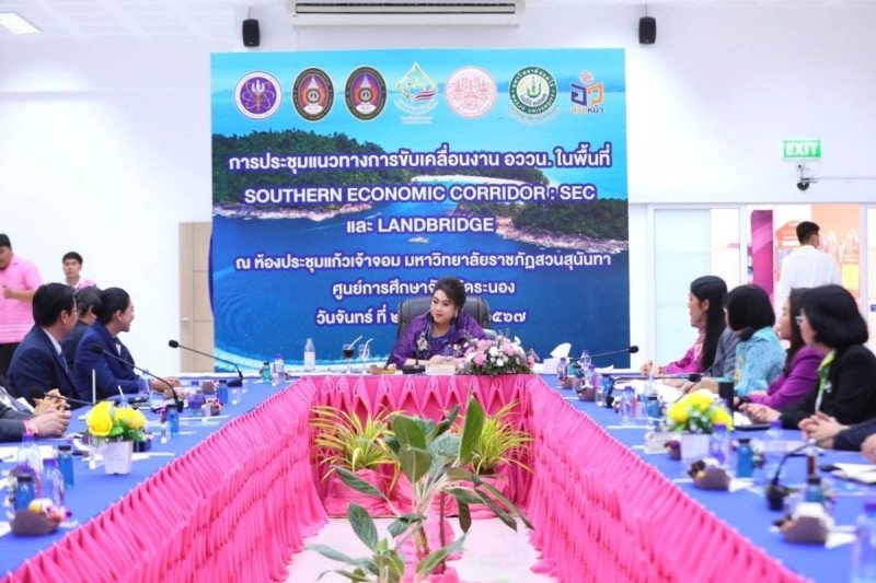 เมื่อวันที่ 22 ม.ค. น.ส.ศุภมาส อิศรภักดี รมว.การอุดมศึกษา วิทยาศาสตร์ วิจัยและนวัตกรรม (อว.) พร้อมด้วย พญ.เพชรดาว โต๊ะมีนา ที่ปรึกษา รมว.อว. น.ส.สุชาดา แทนทรัพย์ เลขานุการ รมว.อว. น.ส.สุณีย์ เลิศเพียรธรรม หัวหน้าผู้ตรวจราชการ อว. และคณะผู้บริหาร อว. ร่วมหารือกับภาคีเครือข่ายความร่วมมือ 6 สถาบัน ได้แก่ วิทยาลัยชุมชนระนอง มหาวิทยาลัยราชภัฏสวนสุนันทา ศูนย์การศึกษาจังหวัดระนอง มหาวิทยาลัยราชภัฏสุราษฎร์ธานี มหาวิทยาลัยแม่โจ้ – ชุมพร สถาบันเทคโนโลยีพระจอมเกล้าเจ้าคุณทหารลาดกระบัง วิทยาเขตชุมพรเขตรอุดมศักดิ์ จังหวัดชุมพร และมหาวิทยาลัยวลัยลักษณ์ เพื่อหาแนวทางการขับเคลื่อนงานอุดมศึกษา วิทยาศาสตร์ วิจัยและนวัตกรรม (อววน.) ในพื้นที่ระเบียงเศรษฐกิจภาคใต้ (Southern Economic Corridor: SEC) และแลนด์บริดจ์ โดยพัฒนาเชื่อมโยง 3 จังหวัดในพื้นที่อ่าวไทย-อันดามัน (ระนอง ชุมพร และสุราษฎร์ธานี) ณ ห้องประชุมแก้วเจ้าจอม อาคารเรียนรวม A มหาวิทยาลัยราชภัฏสวนสุนันทา ศูนย์การศึกษาระนองจังหวัดระนอง