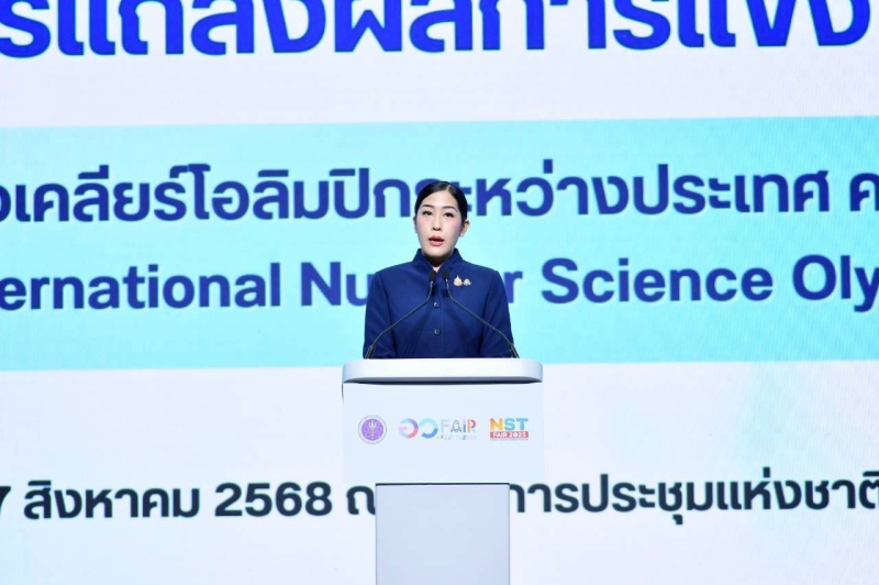 วันที่ 17 สิงหาคม 2568 นางสาวพลอย ธนิกุล ผู้ช่วยรัฐมนตรีว่าการกระทรวงการอุดมศึกษา วิทยาศาสตร์ วิจัยและนวัตกรรม (อว.) เป็นประธานเปิดงานแถลงผลการแข่งขันโอลิมปิกวิทยาศาสตร์นิวเคลียร์นานาชาติ ครั้งที่ 2 (The 2nd International Nuclear Science Olympiad) พร้อมมอบโล่ประกาศเกียรติคุณแก่หน่วยงานที่ให้การสนับสนุนและมอบเกียรติบัตรแก่ผู้เข้าแข่งขัน โดยมี พลตรี รศ.ดร.ชัยณรงค์ เชิดชู นายกสมาคมนิวเคลียร์แห่งประเทศไทย นางสาวสุณีย์ เลิศเพียรธรรม รองปลัดกระทรวง อว. ผู้บริหารหน่วยงานที่ให้การสนับสนุน ผู้เข้าร่วมการแข่งขัน และผู้สนใจเข้าร่วมอย่างคับคั่ง ณ เวที Main Stage ภายในงาน อว. แฟร์ 2025 ศูนย์การประชุมแห่งชาติสิริกิติ์