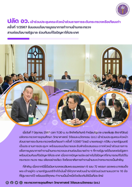 เมื่อวันที่ 7 มิถุนายน 256 เวลา 11.30 น. ณ ตึกภักดีบดินทร์ ทำเนียบรัฐบาล นายเพิ่มสุข สัจจาภิวัฒน์ ปลัดกระทรวงการอุดมศึกษา วิทยาศาสตร์ วิจัยและนวัตกรรม (อว.) เข้าร่วมประชุมคณะหัวหน้าส่วนราชการระดับกระทรวงหรือเทียบเท่า ครั้งที่ 1/2567 โดยมี นายเศรษฐา ทวีสิน นายกรัฐมนตรี เป็นประธานการประชุมฯ พร้อมมอบนโยบายและรับฟังข้อเสนอแนะจากหัวหน้าส่วนราชการ เพื่อการบูรณาการทำงานข้ามกระทรวงและสานต่อนโยบายต่างๆ ที่ทางรัฐบาลได้แถลงต่อรัฐสภา พร้อมร่วมกันแก้ไขปัญหาให้ประเทศ เนื่องจากปัญหาแต่ละอย่างไม่ใช่ปัญหาที่สามารถแก้ไขได้ในกระทรวง ทบวง กรม เพียงอย่างเดียว จึงต้องอาศัยการทำงานข้ามระหว่างกระทรวงเป็นสำคัญ