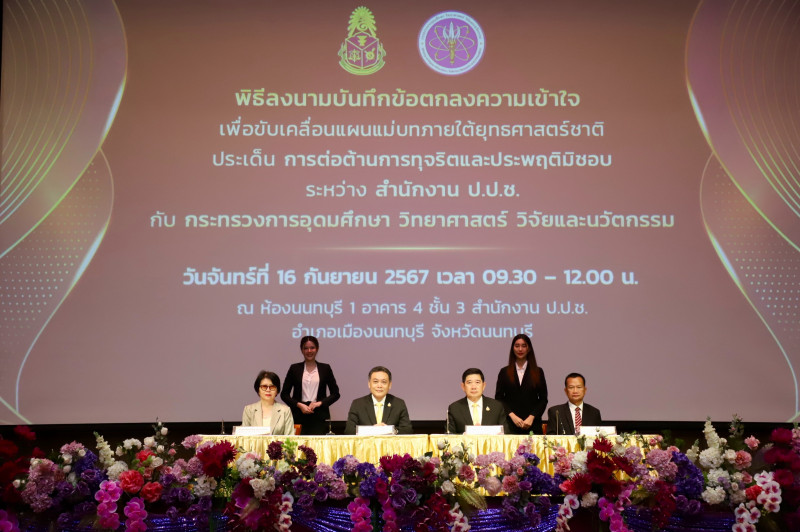 เมื่อวันที่ 16 กันยายน 2567 นายเพิ่มสุข สัจจาภิวัฒน์ ปลัดกระทรวงการอุดมศึกษา วิทยาศาสตร์ วิจัยและนวัตกรรม (อว.) พร้อมด้วย นายนิวัติไชย เกษมมงคล เลขาธิการคณะกรรมการป้องกันและปราบปรามการทุจริตแห่งชาติ (ป.ป.ช.) ได้ร่วมกันลงนามบันทึกข้อตกลงความเข้าใจ เพื่อขับเคลื่อนแผนแม่บทภายใต้ยุทธศาสตร์ชาติในประเด็นการต่อต้านการทุจริตและประพฤติมิชอบ ระหว่าง กระทรวง อว. และ สำนักงาน ป.ป.ช. โดยมี ดร.จันทร์เพ็ญ เมฆาอภิรักษ์ รองปลัดกระทรวง อว. และนายอุทิศ บัวศรี รองเลขาธิการคณะกรรมการ ป.ป.ช. ร่วมเป็นสักขีพยานในพิธีลงนามฯ ณ ห้องนนทบุรี 1 ชั้น 3 อาคาร 4 สำนักงาน ป.ป.ช. จังหวัดนนทบุรี