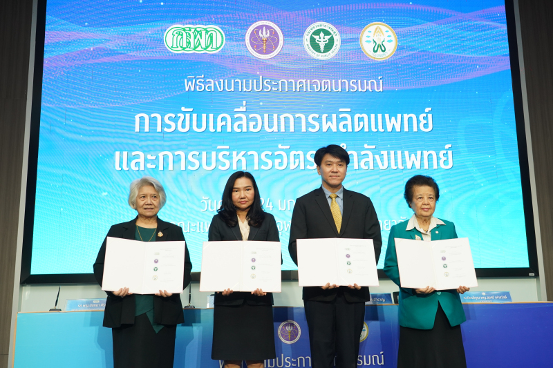 ในพิธีลงนามประกาศเจตนารมณ์ครั้งนี้ มี 4 ผู้แทนจากหน่วยงานหลักร่วมลงนาม ได้แก่ นางสาววราภรณ์ รุ่งตระการ ที่ปรึกษาด้านระบบบริหารการอุดมศึกษา วิทยาศาสตร์ วิจัยและนวัตกรรม รักษาการราชการแทนรองปลัดกระทรวง อว. รองศาสตราจารย์แพทย์หญิงนันทนา ศิริทรัพย์ เลขาธิการ กลุ่มสถาบันแพทยศาสตร์แห่งประเทศไทย (กสพท.) นายแพทย์เกษม ตั้งเกษมสำราญ ผู้แทนปลัดกระทรวงสาธารณสุข และ ศาสตราจารย์เกียรติคุณ แพทย์หญิงสมศรี เผ่าสวัสดิ์ นายกแพทยสภา โดยมีวัตถุประสงค์เพื่อร่วมกันขับเคลื่อนการผลิตแพทย์และการบริหารอัตรากำลังแพทย์ให้สอดคล้องกับความต้องการของประเทศ รวมถึงการพัฒนาบุคลากรทางการแพทย์ให้มีคุณภาพ พร้อมรองรับการขยายตัวของระบบสุขภาพในอนาคต