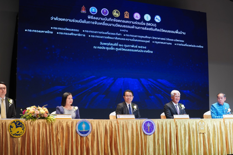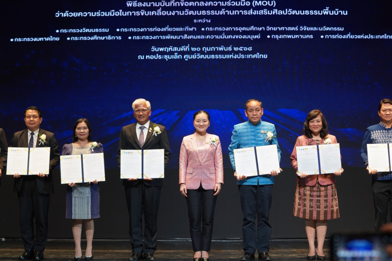 เมื่อวันที่ 20 ก.พ. นายวันนี นนท์ศิริ ผู้ตรวจราชการกระทรวงการอุดมศึกษา วิทยาศาสตร์ วิจัยและนวัตกรรม (อว.) ได้รับมอบหมายจาก ศ.ดร. ศุภชัย ปทุมนากุล ปลัดกระทรวง อว. ได้เป็นผู้แทนในพิธีลงนามข้อตกลงความร่วมมือในการขับเคลื่อนงานวัฒนธรรมด้านการส่งเสริมศิลปวัฒนธรรมพื้นบ้าน ร่วมกับหน่วยงานที่เกี่ยวข้องทั้งหมด 8 หน่วยงาน ได้แก่ กระทรวง อว. กระทรวงวัฒนธรรม กระทรวงการท่องเที่ยวและกีฬา กระทรวงการพัฒนาสังคมและความมั่นคงของมนุษย์ กระทรวงมหาดไทย กระทรวงศึกษาธิการ กรุงเทพมหานคร และการท่องเที่ยวแห่งประเทศไทย โดยมี นางสาวสุดาวรรณ หวังศุภกิจโกศล รมว.วัฒนธรรม เป็นประธานในพิธี ณ หอประชุมเล็ก ศูนย์วัฒนธรรมแห่งประเทศไทย