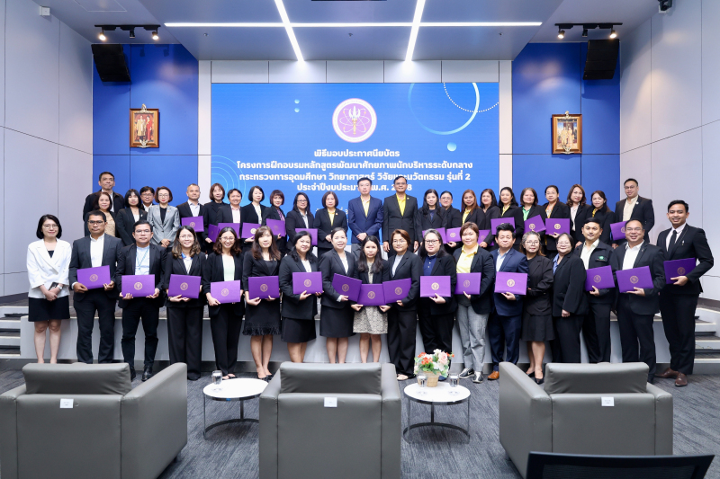 ”ขอแสดงความยินดีและชื่นชมต่อความสำเร็จของทุกท่านที่ผ่านการฝึกอบรม จนทำให้ได้รับประกาศนียบัตรในวันนี้ ทั้งนี้ขอให้ทุกท่านที่ผ่านการอบรมตั้งใจปฏิบัติหน้าที่ด้วยด้วยความซื่อสัตยสุจริต เพื่อความเจริญก้าวหน้าขององค์กร และขอให้ทุกท่านปฏิบัติงานอย่างเต็มที่ เต็มความสามารถปฏิบัติงานอย่างเต็มกำลัง ร่วมกันขับเคลื่อนภารกิจของกระทรวงให้บรรลุเป้าหมายร่วมกัน“ ปลัด อว. กล่าว