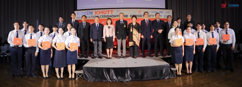 เมื่อวันที่ 26 กันยายน นางวัฒนาโสภี สุขสอาด ผู้อำนวยการโครงการสถาบันไทยโคเซ็น รักษาการในตำแหน่งที่ปรึกษาด้านยุทธศาสตร์และแผนการอุดมศึกษา วิทยาศาสตร์ วิจัยและนวัตกรรม ได้รับมอบหมายจากศาสตราจารย์ ดร.ศุภชัย ปทุมนากุล ปลัดกระทรวง อว. ร่วมแสดงความยินดีและมอบโอวาทในงานพิธีสำเร็จการศึกษาของนักเรียนทุนรัฐบาลไทยโคเซ็น รุ่นที่ 1 สถาบันโคเซ็นแห่งมหาวิทยาลัย พระจอมเกล้าธนบุรี โดยมีรองศาสตราจารย์ ดร.สุวิทย์ แซ่เตีย อธิการบดีกล่าวเปิดงานและมอบประกาศนียบัตรให้แก่ผู้สำเร็จการศึกษาหลักสูตรวิศวกรรมศาสตร์ สาขาวิศวกรรมอัตโนมัติ จำนวน 19 คน พร้อมด้วยผู้แทนหน่วยงานรัฐบาลญี่ปุ่นร่วมกล่าวแสดงความยินดีแก่ผู้สำเร็จการศึกษา ประกอบด้วย นางคาวามุระ มากิ ผู้อำนวยการสำนักข่าวสารญี่ปุ่นและที่ปรึกษาเอกอัครราชทูตญี่ปุ่นประจำประเทศไทย สถานเอกอัครราชทูตญี่ปุ่นประจำประเทศไทย นายซาคูโดะ ชุนสุเกะ หัวหน้าผู้แทนองค์การความร่วมมือระหว่างประเทศแห่งญี่ปุ่น สำนักงานประเทศไทย (JICA) ดร.นากาชิมะ ฮิเดฮา ผู้อำนวยการบริหารอาวุโส ผู้แทนสถาบันเทคโนโลยีแห่งชาติญี่ปุ่น (NIT) นายโนบุยุกิ อิชิอิ กรรมการบริหารอาวุโส ผู้แทนหอค้าการไทย-ญี่ปุ่น และคณะผู้บริหารและคณาจารย์มหาวิทยาลัยเทคโนโลยีพระจอมเกล้าธนบุรี เข้าร่วมงาน ณ ห้องออดิทอเรียม ชั้น 3 อาคารเรียนรู้พหุวิทยาการ (LX Building) มจธ.