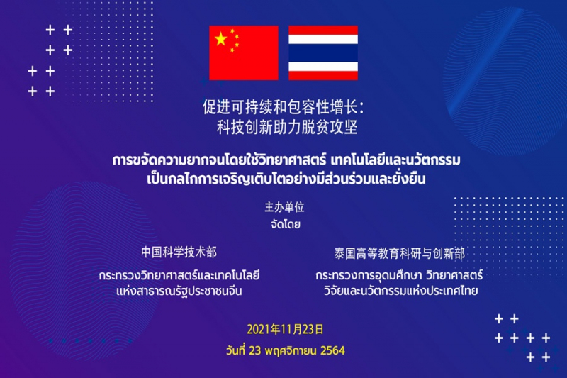 กระทรวงการอุดมศึกษา วิทยาศาสตร์ วิจัยและนวัตกรรม ร่วมกับ Ministry of Science and Technology (MOST) สาธารณรัฐประชาชนจีน จัดการประชุมเรื่องการขจัดความยากจนโดยใช้วิทยาศาสตร์ เทคโนโลยีและนวัตกรรมเป็นกลไกสู่การเจริญเติบโตอย่างมีส่วนร่วมและยั่งยืน (Toward Inclusive and Sustainable Growth: Poverty Alleviation through STI) ผ่านระบบออนไลน์ เมื่อวันที่ ๒๓ พฤศจิกายนที่ผ่านมา มีวัตถุประสงค์เพื่อเปิดเวทีในการแลกเปลี่ยนเรียนรู้ในเชิงนโยบาย ยุทธศาสตร์และมาตรการการขจัดความยากจนโดยใช้วิทยาศาสตร์และเทคโนโลยีเป็นกลไกที่สำคัญ รวมทั้งแสวงหาแนวทางในการริเริ่มความร่วมมือ ระหว่างไทยและจีน โดยมีผู้เข้าร่วมการประชุมจากหน่วยงานที่เกี่ยวข้องและสถาบันอุดมศึกษาของไทยและจีนจำนวนกว่า ๑๙๐ คน