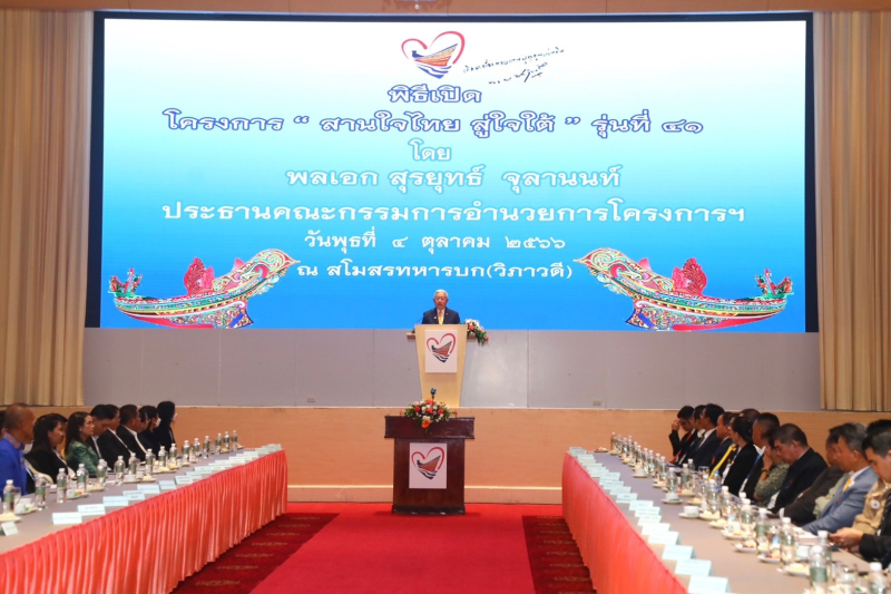 เมื่อวันที่ 4 ต.ค. พลเอก สุรยุทธ์ จุลานนท์ ประธานองคมนตรี และประธานคณะกรรมการอำนวยการโครงการ “สานใจไทย สู่ใจใต้“ เป็นประธานเปิดโครงการ "สานใจไทย สู่ใจใต้" รุ่นที่ 41 โดยมี นายอารีย์ วงศ์อารยะ รองประธานคณะกรรมการอำนวยการโครงการฯ นางสาวสุณีย์ เลิศเพียรธรรม หัวหน้าผู้ตรวจราชการกระทรวงการอุดมศึกษา วิทยาศาสตร์ วิจัยและนวัตกรรม (อว.) เข้าร่วม ณ ห้องมัฆวานรังสรรค์ ชั้น 3 สโมสรทหารบก (ส่วนกลาง) วิภาวดี กรุงเทพฯ