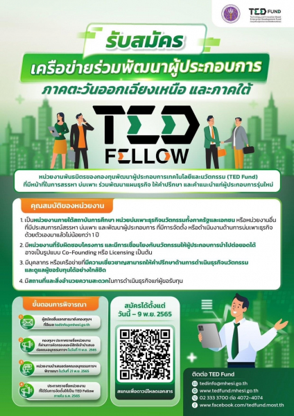 ในปี 2566 นี้ TED Fund ขอเชิญชวนหน่วยงานในพื้นที่ 2 ภูมิภาค คือ ภาคตะวันออกเฉียงเหนือ และภาคใต้ ที่มีความเชี่ยวชาญ และความพร้อมที่จะดูแลบ่มเพาะพัฒนาผู้ประกอบการนวัตกรรมรุ่นใหม่ มาสมัครเป็นเครือข่ายร่วมพัฒนาผู้ประกอบการ (TED Fellow) เพื่อเป็นการกระจายโอกาสในการเข้าถึงแหล่งเงินทุนให้แก่ผู้ประกอบการในส่วนภูมิภาคเพิ่มเติม