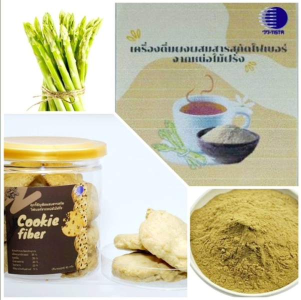 จากคุณประโยชน์ของเศษเหลือทิ้งหน่อไม้ฝรั่งดังกล่าว วว. โดย ศูนย์เชี่ยวชาญนวัตกรรมอาหารสุขภาพ จึงได้ศึกษาการสกัดเส้นใยอาหารจากเศษเหลือทิ้งหน่อไม้ฝรั่งด้วยวิธีการสกัดด้วยเอนไซม์แอลฟา-อะไมเลส อัลคาเลส และอะไมโลกลูโคซิเดส และการสกัดด้วยน้ำ โดยได้เส้นใยอาหารที่มีความบริสุทธิ์สูงขึ้นและมีคุณสมบัติเชิงหน้าที่ในการอุ้มน้ำและอุ้มน้ำมันดีขึ้น นอกจากนั้นยังได้ศึกษาการสกัดเส้นใยอาหารที่ละลายน้ำได้ด้วยวิธีการสกัดด้วยเอนไซม์เซลลูเลส เพื่อให้ได้ผลผลิตเส้นใยอาหารที่ละลายน้ำได้สูงและขยายขนาดการสกัดสู่ระดับอุตสาหกรรม อีกทั้งประยุกต์ใช้เส้นใยอาหารที่ผลิตได้นำมาเป็นส่วนผสมในผลิตภัณฑ์อาหารและเครื่องดื่ม โดยการวิเคราะห์คุณค่าทางโภชนาการของผลิตภัณฑ์ที่ วว. พัฒนา มีดังนี้