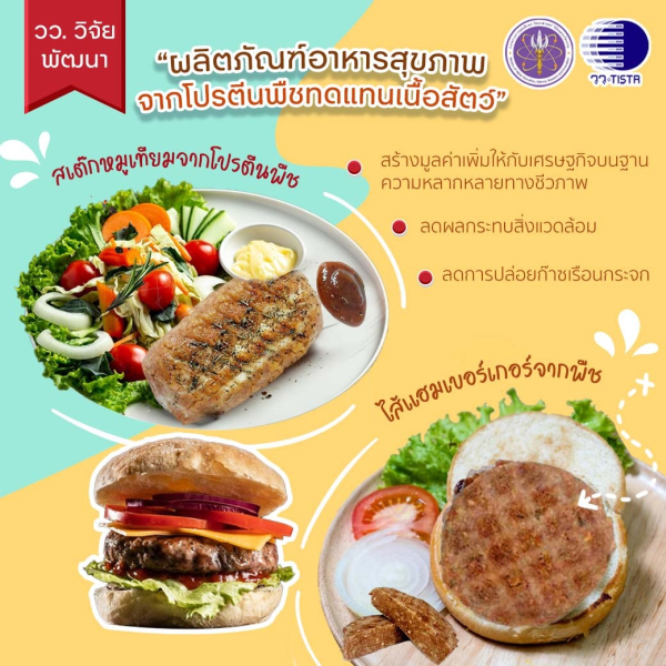 กระทรวงการอุดมศึกษา วิทยาศาสตร์ วิจัยและนวัตกรรม (อว.) โดย ศูนย์เชี่ยวชาญนวัตกรรมอาหารสุขภาพ (วว.) สถาบันวิจัยวิทยาศาสตร์และเทคโนโลยีแห่งประเทศไทย (วว.) วิจัยพัฒนาผลิตภัณฑ์อาหารสุขภาพจากโปรตีนพืช เพื่อทดแทนเนื้อสัตว์ ได้แก่ สเต๊กหมูเทียม ผลิตภัณฑ์ไส้แฮมเบอร์เกอร์จากพืชเสริมเห็ดแครง และผลิตภัณฑ์นักเก็ตจากโปรตีนถั่วแดงเข้มข้น พร้อมถ่ายทอดเทคโนโลยีการผลิตสู่เชิงพาณิชย์ ตอบสนองความต้องการของผู้บริโภคและช่วยลดมลภาวะต่อสิ่งแวดล้อมที่เกิดขึ้นจากกระบวนการทางปศุสัตว์