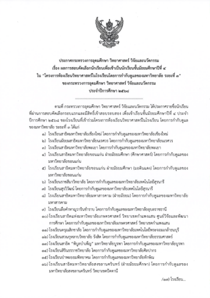 ผลการสอบคัดเลือกนักเรียนเพื่อเข้าเป็นนักเรียนชั้นมัธยมศึกษาปีที่ 4 ใน "โครงการห้องเรียนวิยาศาสตร์ในโรงเรียน โดยการกำกับดูแลของมหาวิทยาลัย ระยะที่ 1" ประจำปีการศึกษา 2568