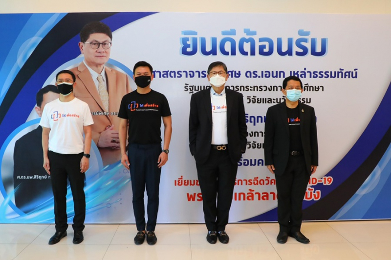 เมื่อวันที่ 11 มิถุนายน ศ.(พิเศษ) ดร.เอนก เหล่าธรรมทัศน์ รัฐมนตรีว่าการกระทรวงการอุดมศึกษา วิทยาศาสตร์ วิจัยและนวัตกรรม (อว.) พร้อม พร้อม ศ.ดร.นพ.สิริฤกษ์ ทรงศิวิไล ปลัด อว. ศ.ดร.ศุภชัย ปทุมนากุล รองปลัด อว. และคณะผู้บริหาร อว. เดินทางไปเยี่ยมชม “ศูนย์บริการฉีดวัคซีนโควิด-19 สจล.” ซึ่งเป็นศูนย์ฉีดวัคซีนนอกโรงพยาบาล ตามนโยบายของ อว. โดยมี ศ.ดร.สุชัชวีร์ สุวรรณสวัสดิ์ อธิการบดี สถาบันเทคโนโลยีพระจอมเกล้าเจ้าคุณทหารลาดกระบัง (สจล.) รวมถึงคณะบดีคณะแพทยศาสตร์และคณาจารย์ ให้การต้อนรับ