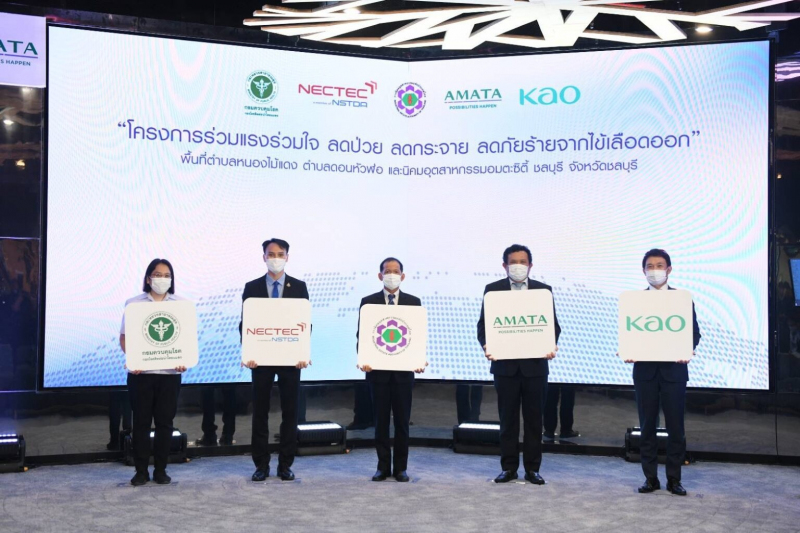 (15 มิ.ย. 64) จ. ชลบุรี : บริษัท คาโอ อินดัสเตรียล (ประเทศไทย) จำกัด เปิดตัวโครงการ “ร่วมแรงร่วมใจ ลดป่วย ลดกระจาย ลดภัยร้ายจากไข้เลือดออก” พื้นที่ตำบลหนองไม้แดง ตำบลดอนหัวฬ่อ และนิคมอุตสาหกรรมอมตะ ซิตี้ ชลบุรี จังหวัดชลบุรี ร่วมกับ 4 องค์กรใหญ่ ได้แก่ บริษัท อมตะ คอร์ปอเรชัน จำกัด (มหาชน) การนิคมอุตสาหกรรมแห่งประเทศไทย (กนอ.) กองโรคติดต่อนำโดยแมลง กรมควบคุมโรค กระทรวงสาธารณสุข และศูนย์เทคโนโลยีอิเล็กทรอนิกส์และคอมพิวเตอร์แห่งชาติ (เนคเทค) หน่วยงานภายใต้สำนักงานพัฒนาวิทยาศาสตร์และเทคโนโลยีแห่งชาติ (สวทช.) กระทรวงการอุดมศึกษา วิทยาศาสตร์ วิจัยและนวัตกรรม (อว.) เดินหน้ากิจกรรมเพื่อสนับสนุนโครงการ และลดจำนวนผู้ป่วยรวมถึงผู้เสียชีวิตจากโรคไข้เลือดออก เนื่องในวันไข้เลือดออกอาเซียน นำร่องโครงการฯ ในเขตตำบลหนองไม้แดง ตำบลดอนหัวฬ่อ และนิคมอุตสาหกรรมอมตะ ซิตี้ จังหวัดชลบุรี ให้ปลอดไข้เลือดออกภายใน 3 ปี พร้อมเปิดตัวแอปพลิเคชัน “รู้ทัน” มุ่งให้ประชาชนรู้ทันโรคภัยไข้เจ็บ พร้อมมีสุขภาพที่ดีอย่างยั่งยืน