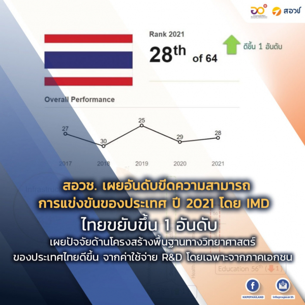 สอวช. เผยอันดับขีดความสามารถการแข่งขันของประเทศ ปี 2021 โดย IMD ไทยขยับขึ้น 1 อันดับ เผยปัจจัยด้านโครงสร้างพื้นฐานทางวิทยาศาสตร์ของประเทศไทยดีขึ้น จากค่าใช้จ่าย R&D โดยเฉพาะจากภาคเอกชน