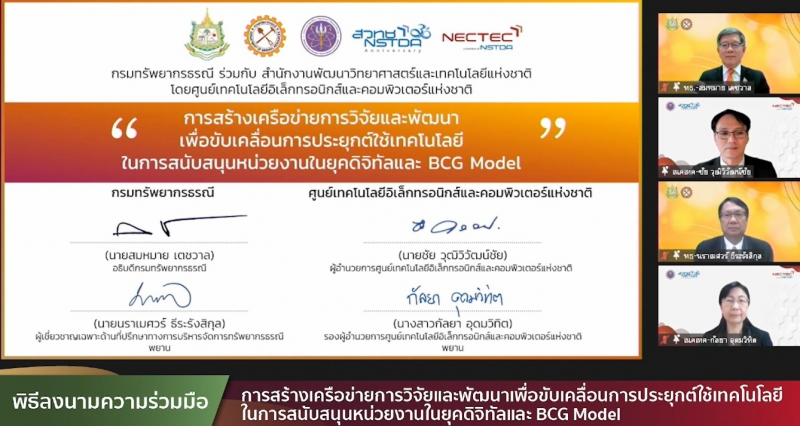 วันที่ 26 สิงหาคม 2564 กระทรวงการอุดมศึกษา วิทยาศาสตร์ วิจัยและนวัตกรรม (อว.) สำนักงานพัฒนาวิทยาศาสตร์และเทคโนโลยีแห่งชาติ (สวทช.) โดย ศูนย์เทคโนโลยีอิเล็กทรอนิกส์และคอมพิวเตอร์แห่งชาติ (เนคเทค)  และ กรมทรัพยากรธรณี (ทธ.) กระทรวงทรัพยากรธรรมชาติและสิ่งแวดล้อม (ทส.) ร่วมลงนามบันทึกข้อตกลงความร่วมมือ “การสร้างเครือข่ายการวิจัยและพัฒนา เพื่อขับเคลื่อนการประยุกต์ใช้เทคโนโลยีในการสนับสนุนหน่วยงานในยุคดิจิทัลและ BCG Model” ในรูปแบบออนไลน์ผ่านระบบ Zoom Meeting เพื่อเดินหน้านำวิทยาศาสตร์ เทคโนโลยี และนวัตกรรม (วทน.) สู่การอนุรักษ์ ป้องกัน และจัดการแหล่งเรียนรู้ สร้างมูลค่าและประโยชน์ของงานทางด้านธรณีวิทยา ธรณีพิบัติภัย และอุทยานธรณี สอดรับโมเดลเศรษฐกิจใหม่สู่การพัฒนาที่ยั่งยืน BCG Economy model รวมทั้งสอดคล้องกับการปรับเปลี่ยนกรมทรัพยากรธรณี สู่การเป็นองค์กรดิจิทัลในอนาคต
