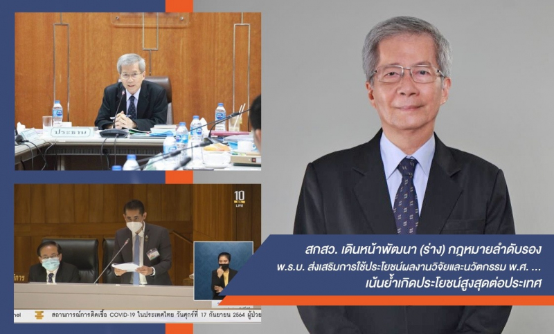 โอกาสนี้ รองศาสตราจารย์ ดร.พงศ์พันธ์ แก้วตาทิพย์ รองผู้อำนวยการสำนักงานคณะกรรมการส่งเสริมวิทยาศาสตร์ วิจัยและนวัตกรรม (สกสว.) ได้รายงานความก้าวหน้าต่อประเด็นดังกล่าวในที่ประชุมว่า ขณะนี้กฎหมายดังกล่าว อยู่ในกระบวนการรอโปรดเกล้าฯ ลงพระปรมาภิไธยและประกาศพระราชกิจจานุเบกษา ก่อนมีผลบังคับใช้ภายใน 180 วัน ช่วงเวลานี้จึงเป็นเวลาที่คณะทำงาน สกสว. และ สำนักงานสภานโยบายการอุดมศึกษา วิทยาศาสตร์ วิจัยและนวัตกรรมแห่งชาติ (สอวช.) จัดทำอนุบัญญัติ หรือกฎหมายลำดับรองให้เรียบร้อย โดยขณะนี้ยังอยู่ในขั้นตอนดำเนินการรับฟังความคิดเห็น (ร่าง) กฎหมายลำดับรองจากหน่วยงานเพิ่มเติม หลังจากรับฟังข้อเสนอแนะจากทาง ศาสตราจารย์ (พิเศษ) ดร. เอนก เหล่าธรรมทัศน์ รัฐมนตรีว่าการกระทรวงการอุดมศึกษา วิทยาศาสตร์ วิจัยและนวัตกรรม (อว.) รวมถึงการจัดเวทีรับฟังความคิดเห็นจากผู้มีส่วนได้ส่วนเสียใน 46 หน่วยงาน จำนวน 2 ครั้ง