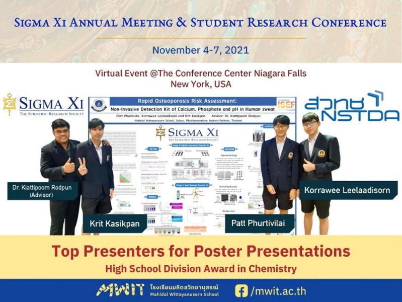 สำนักงานพัฒนาวิทยาศาสตร์และเทคโนโลยีแห่งชาติ สวทช. ฝ่ายส่งเสริมและพัฒนาเด็กและเยาวชนที่มีศักยภาพสูง โครงการการประกวดโครงงานของนักวิทยาศาสตร์รุ่นเยาว์ (Young Scientist Competition: YSC) ขอแสดงความยินดีกับเยาวชนโครงการ YSC นายกฤษฎิ์ กสิกพันธุ์ นายพัฒฒ์ พฤฒิวิลัย และ นายกรวีร์ ลีลาอดิศร นักเรียนโรงเรียนมหิดลวิทยานุสรณ์ โดยมี ดร. เกียรติภูมิ รอดพันธ์ ที่ปรึกษาโครงงาน ในการนำผลงาน โครงงาน Rapid Osteoporosis Risk Assessment: Non-Invasive Detection Kit of Calcium, Phosphate and pH in Human Sweat คว้ารางวัล Top Presenters ในการนำเสนอภาคโปสเตอร์ระดับมัธยมศึกษาตอนปลาย ในสาขาเคมี  จากการประชุมวิชาการระดับนานาชาติ Sigma Xi Annual Meeting & Student Research Conference พร้อมรับสิทธิ์เป็นสมาชิก Sigma Xi องค์กรวิทยาศาสตร์ระดับโลกซึ่งจัดขึ้นระหว่างวันที่ 4-7 พฤศจิกายน พ.ศ. 2564 ในรูปแบบออนไลน์ ณ The Conference Center Niagara Falls รัฐนิวยอร์ก สหรัฐอเมริกา