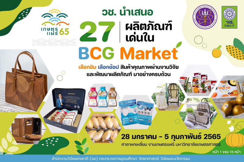 สำนักงานการวิจัยแห่งชาติ (วช.) กระทรวงการอุดมศึกษา วิทยาศาสตร์ วิจัยและนวัตกรรม ร่วมจัดบูธงาน “อว. BCG Market” ในงานเกษตรแฟร์ ประจำปี 2565 “เกษตรวิถีใหม่ หลังมหันตภัยโควิด” ระหว่างวันที่ 28 มกราคม–5 กุมภาพันธ์ 2565 ณ ศาลาหกเหลี่ยม มหาวิทยาลัยเกษตรศาสตร์ กรุงเทพมหานคร เพื่อเผยแพร่ประชาสัมพันธ์ผลงานวิจัยและนวัตกรรมที่เกี่ยวข้องกับเศรษฐกิจชีวภาพ เศรษฐกิจหมุนเวียน และเศรษฐกิจสีเขียว (BCG) นำมาพัฒนาคุณภาพและยกระดับให้ได้มาตราฐาน รวมถึงการสร้างสรรค์ สร้างรายได้ช่วยเหลือเกษตรกร ผู้ประกอบการ ให้มีช่องทางการจำหน่ายสินค้าและผลิตภัณฑ์ทางการเกษตร และกระตุ้นเศรษฐกิจฐานรากของประเทศ อีกด้วย
