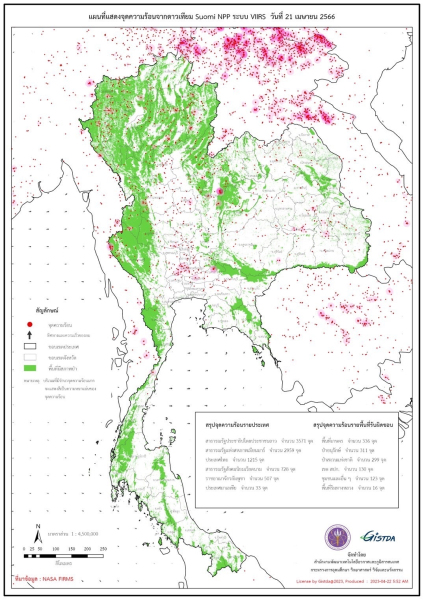 GISTDA เผยข้อมูลจากดาวเทียมซูโอมิ เอ็นพีพี (Suomi NPP) ของวันที่ 21 เมษายน 2566 ไทยพบจุดความร้อน 1,215 จุด ในขณะที่จุดความร้อนของประเทศเพื่อนบ้านอย่าง สปป.ลาว อยู่ที่ 3,571 จุด, พม่า 2,959 จุด, เวียดนาม 728 จุด, กัมพูชา 507 จุด และ มาเลเซีย 33 จุด