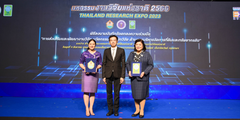 วันที่ 9 สิงหาคม 2566 สำนักงานการวิจัยแห่งชาติ (วช.) กระทรวงการอุดมศึกษา วิทยาศาสตร์ วิจัยและนวัตกรรม ร่วมกับ สำนักงานคณะกรรมการนโยบายที่ดินแห่งชาติ (สคทช.) สำนักนายกรัฐมนตรี จัดพิธีลงนามบันทึกข้อตกลงความร่วมมือ “การส่งเสริมและพัฒนางานวิจัย นวัตกรรม และนักวิจัย ด้านการบริหารจัดการที่ดินและทรัพยากรดิน” โดย ดร.วิภารัตน์ ดีอ่อง ผู้อำนวยการสำนักงานการวิจัยแห่งชาติ และ ดร.รวีวรรณ ภูริเดช ผู้อำนวยการสำนักงานคณะกรรมการนโยบายที่ดินแห่งชาติ ร่วมลงนาม โดยมี ศ.ดร.ศุภชัย ปทุมนากุล รองปลัดกระทรวง อว. พร้อมด้วย คณะผู้บริหาร ผู้ทรงคุณวุฒิ วช. เป็นสักขีพยาน ณ เวทีกิจกรรม Highlight Stage ในงาน “มหกรรมงานวิจัยแห่งชาติ 2566 : Thailand Research Expo 2023” ชั้น 22 โรงแรมเซ็นทาราแกรนด์ และบางกอกคอนเวนชันเซ็นเตอร์ เซ็นทรัลเวิลด์ กรุงเทพฯ
