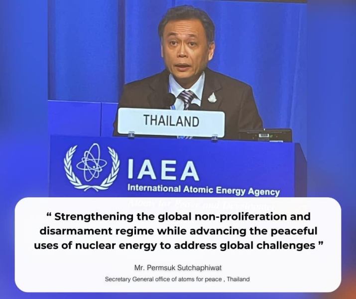 ประเทศไทยพร้อมให้ความร่วมมือกับ IAEA และประชาคมโลกเพื่อพัฒนาการทำงานของหน่วยงานด้านการใช้พลังงานนิวเคลียร์อย่างสันติ สิ่งนี้จะช่วยเพิ่มความเป็นอยู่ที่ดีของประชาชน และสนับสนุนการบรรลุเป้าหมายการพัฒนาที่ยั่งยืนและการปล่อยก๊าซเรือนกระจกสุทธิเป็นศูนย์ทั่วโลก (Global Net Zero) โครงการริเริ่มต่างๆ เช่น การควบคุมโรคจากสัตว์สู่มนุษย์ (ZODIAC) การใช้เทคโนโลยีนิวเคลียร์เพื่อการควบคุมมลพิษจากขยะพลาสติก (NUTEC Plastic) และการใช้รังสีรักษาในทางการแพทย์ (Rays of Hope) ซึ่งเน้นให้เห็นถึงบทบาทที่สำคัญของ IAEA ในการจัดการกับความท้าทายระดับโลก ตั้งแต่การเปลี่ยนแปลงสภาพภูมิอากาศไปจนถึงการเกิดโรคระบาดใหญ่ รวมถึงความมั่นคงทางอาหาร