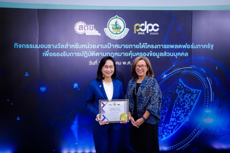 ดร.ชุติมา เอี่ยมโชติชวลิต ผู้ว่าการ สถาบันวิจัยวิทยาศาสตร์และเทคโนโลยีแห่งประเทศไทย (วว.) กระทรวงการอุดมศึกษา วิทยาศาสตร์ วิจัยและนวัตกรรม (อว.) เข้ารับรางวัล Compliance Award ภายใต้โครงการพัฒนาแพลตฟอร์มภาครัฐ เพื่อรองรับการปฏิบัติตามกฎหมายคุ้มครองข้อมูลส่วนบุคคล (Government Platform for PDPA Compliance : GPPC) ประจำปี 2556 จาก นายประเสริฐ จันทรรวงทอง รัฐมนตรีว่าการกระทรวงดิจิทัลเพื่อเศรษฐกิจและสังคม ในฐานะที่ วว. เป็นหน่วยงานซึ่งได้ดำเนินการตามกฎหมายคุ้มครองข้อมูลส่วนบุคคล