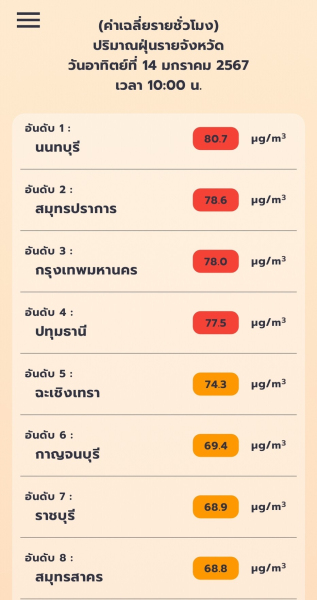 สำหรับภาพรวมประเทศยังเกินมาตรฐาน 34 จังหวัด โดยเฉพาะพื้นที่ภาคเหนือ และภาคกลาง ทั้งนี้ ยังพบว่ามี 4 จังหวัดในพื้นที่ภาคกลางที่มีระดับสีแดงและมีผลกระทบต่อระบบทางเดินหายใจและสุขภาพประชาชน คือนนทบุรี สมุทรปราการ กทม. และปทุมธานี