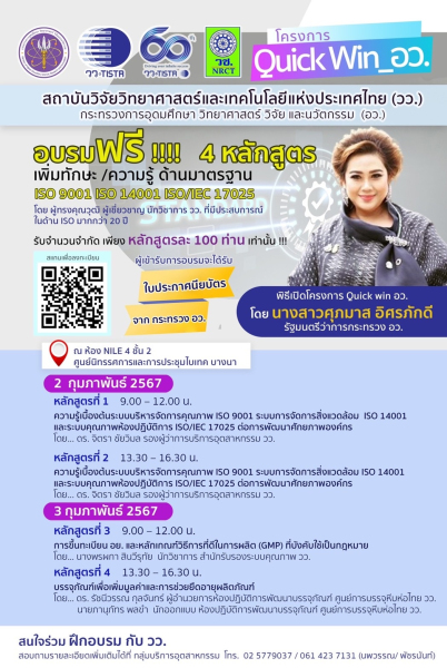กระทรวงการอุดมศึกษา วิทยาศาสตร์ วิจัย และนวัตกรรม (อว.)  โดย  สถาบันวิจัยวิทยาศาสตร์และเทคโนโลยีแห่งประเทศไทย (วว.)  และสำนักงานการวิจัยแห่งชาติ (วช.) จัดอบรมฟรี !  จำนวน  4  หลักสูตร ภายใต้การดำเนินโครงการ Quick win หรือโครงการเร่งด่วนที่เห็นผลเร็วภายใน 3 เดือน  ตามนโยบายของรัฐบาลและนโยบาย นางสาวศุภมาส  อิศรภักดี  รัฐมนตรีว่าการกระทรวง อว. ดังนี้   1) ความรู้เบื้องต้นระบบบริหารจัดการคุณภาพ ISO 9001 ระบบการจัดการสิ่งแวดล้อม ISO 14001  และระบบคุณภาพห้องปฏิบัติการ ISO/IEC 17025 ต่อการพัฒนาศักยภาพองค์กร  2) ความรู้เบื้องต้นระบบบริหารจัดการคุณภาพ ISO 900 1 ระบบการจัดการสิ่งแวดล้อม ISO 14001 และระบบคุณภาพห้องปฏิบัติการ ISO/IEC 17025 ต่อการพัฒนาศักยภาพองค์กร    3) การขึ้นทะเบียน อย. และหลักเกณฑ์วิธีการที่ดีในการผลิต (GMP) ที่บังคับใช้เป็นกฎหมาย  และ 4) บรรจุภัณฑ์เพื่อเพิ่มมูลค่าและการช่วยยืดอายุผลิตภัณฑ์  โดยรับผู้เข้าอบรมจำนวนจำกัด เพียงหลักสูตรละ 100 ท่าน เท่านั้น  **ผู้เข้ารับการอบรม จะได้รับใบประกาศนียบัตร จาก กระทรวง อว.