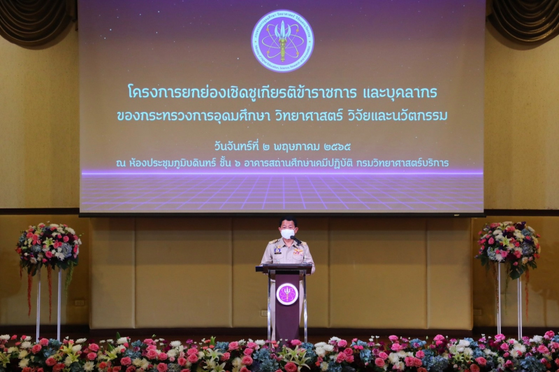 2 พฤษภาคม 2565 ณ ห้องประชุมภูมิบดินทร์ชั้น 6 อาคารสถานศึกษาเคมีปฏิบัติ กรมวิทยาศาสตร์บริการ กรุงเทพมหานคร/ศ.ดร.นพ.สิริฤกษ์ ทรงศิวิไล ปลัดกระทรวงการอุดมศึกษา วิทยาศาสตร์ วิจัยและนวัตกรรม เป็นประธานในพิธีมอบเกียรติบัตรและเข็มเชิดชูเกียรติให้แก่ข้าราชการพลเรือนดีเด่น ในโครงการยกย่องเชิดชูเกียรติคนดีมีคุณธรรมของกระทรวงการอุดมศึกษา วิทยาศาสตร์ วิจัย และนวัตกรรม ประจำปี พ.ศ.2564 เนื่องในโอกาสวันคล้ายวันสถาปนากระทรวงการอุดมศึกษา วิทยาศาสตร์ วิจัยและนวัตกรรม ประจำปี 2565 ซึ่งเวียนมาครบรอบปีที่ 3 มีผู้ได้รับเกียรติบัตร “คนดีศรี อว. จำนวน 14 ราย และข้าราชการพลเรือนดีเด่น จำนวน 82 ราย
